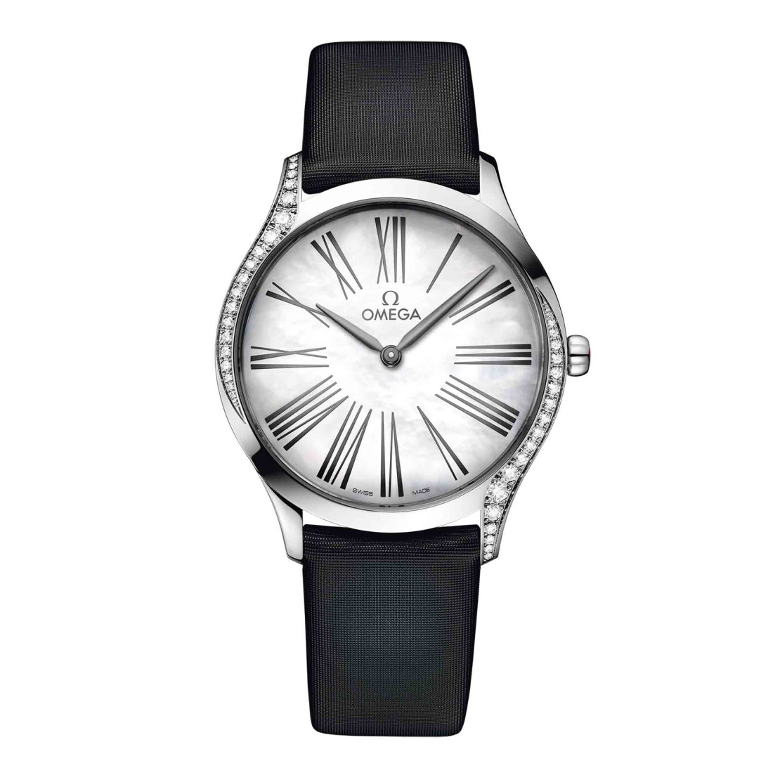 Edelstahl mit einem Diamantbesatz, der sich an den beiden äußeren Seiten an das Gehäuse schmiegt