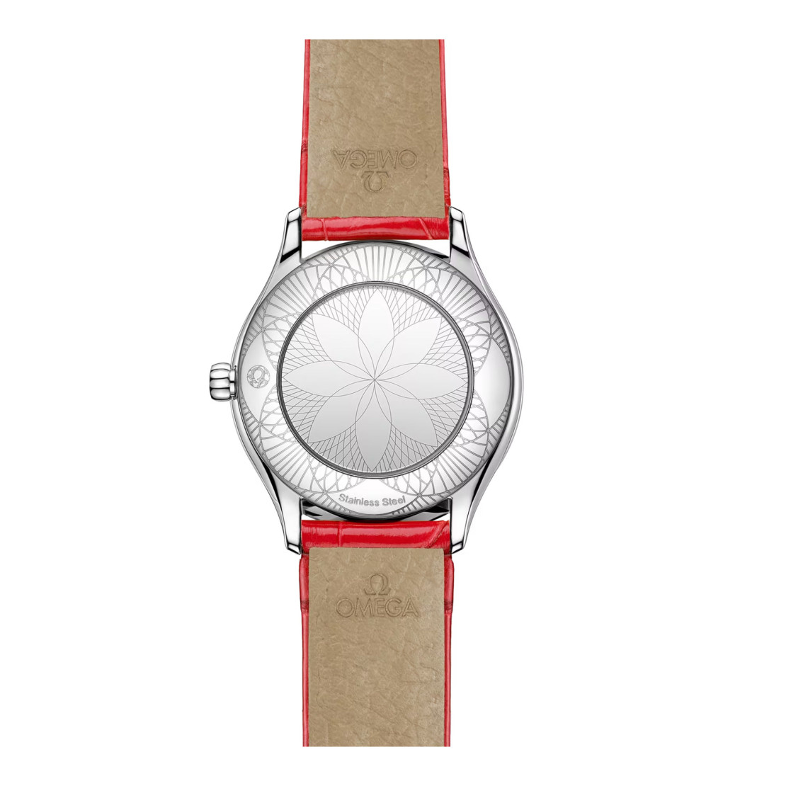 Präsentiert wird die Uhr an einem rot lackierten Alligatorlederarmband mit Trésor-Schließe. Für den Antrieb sorgt das OMEGA Kaliber 4061, das sich hinter einem speziellen, verspiegelten Gehäuseboden mit metallisiertem „Her Time“-Motiv befindet.