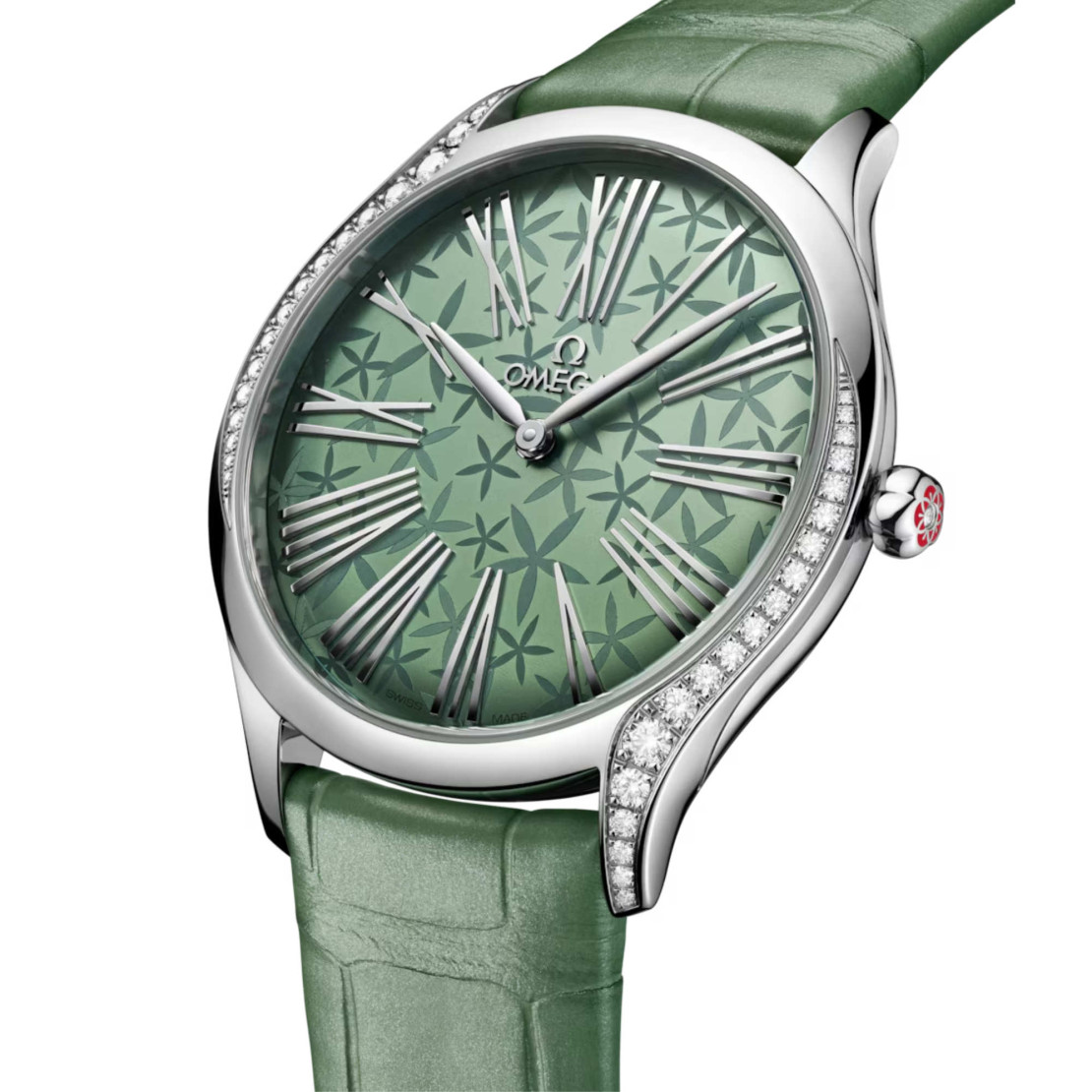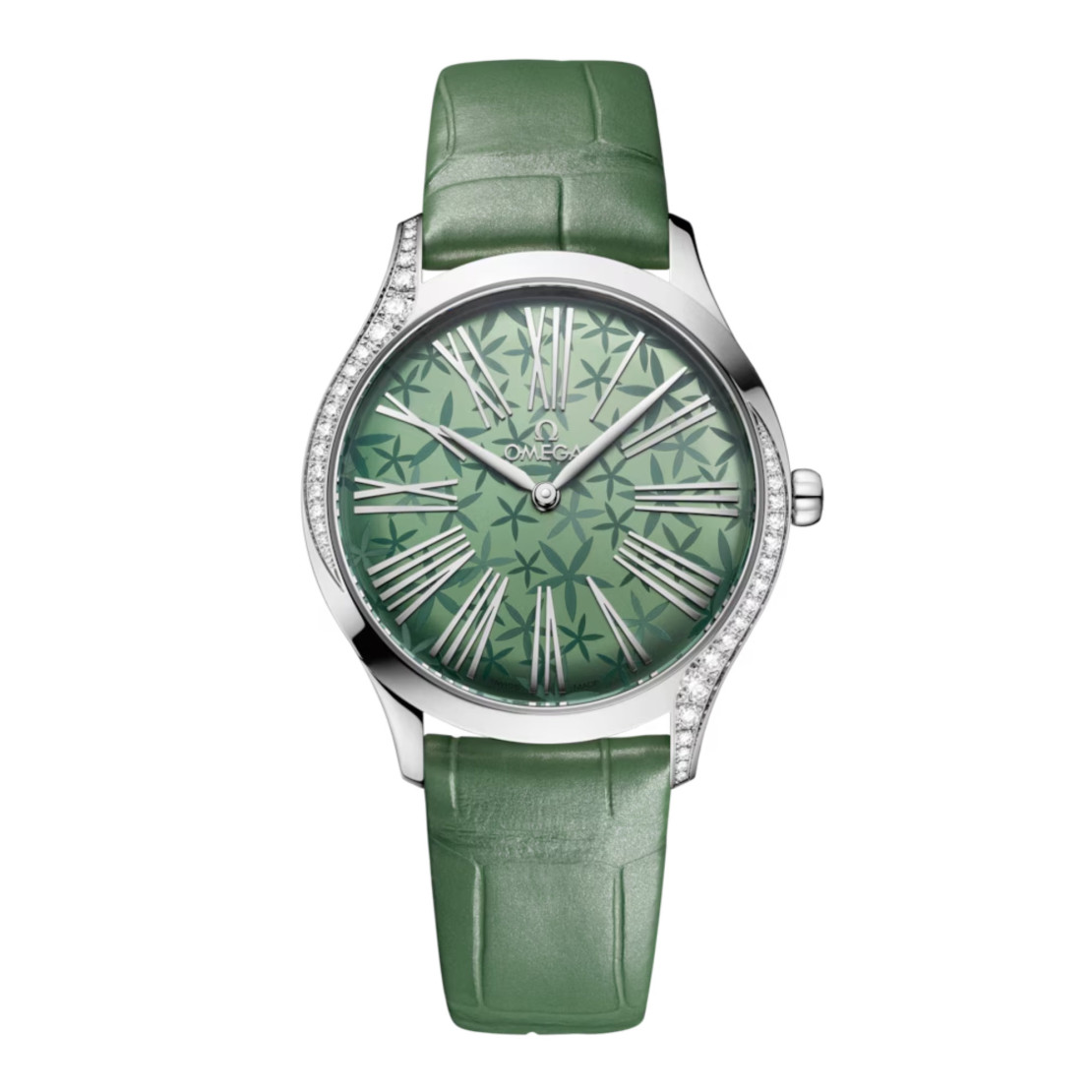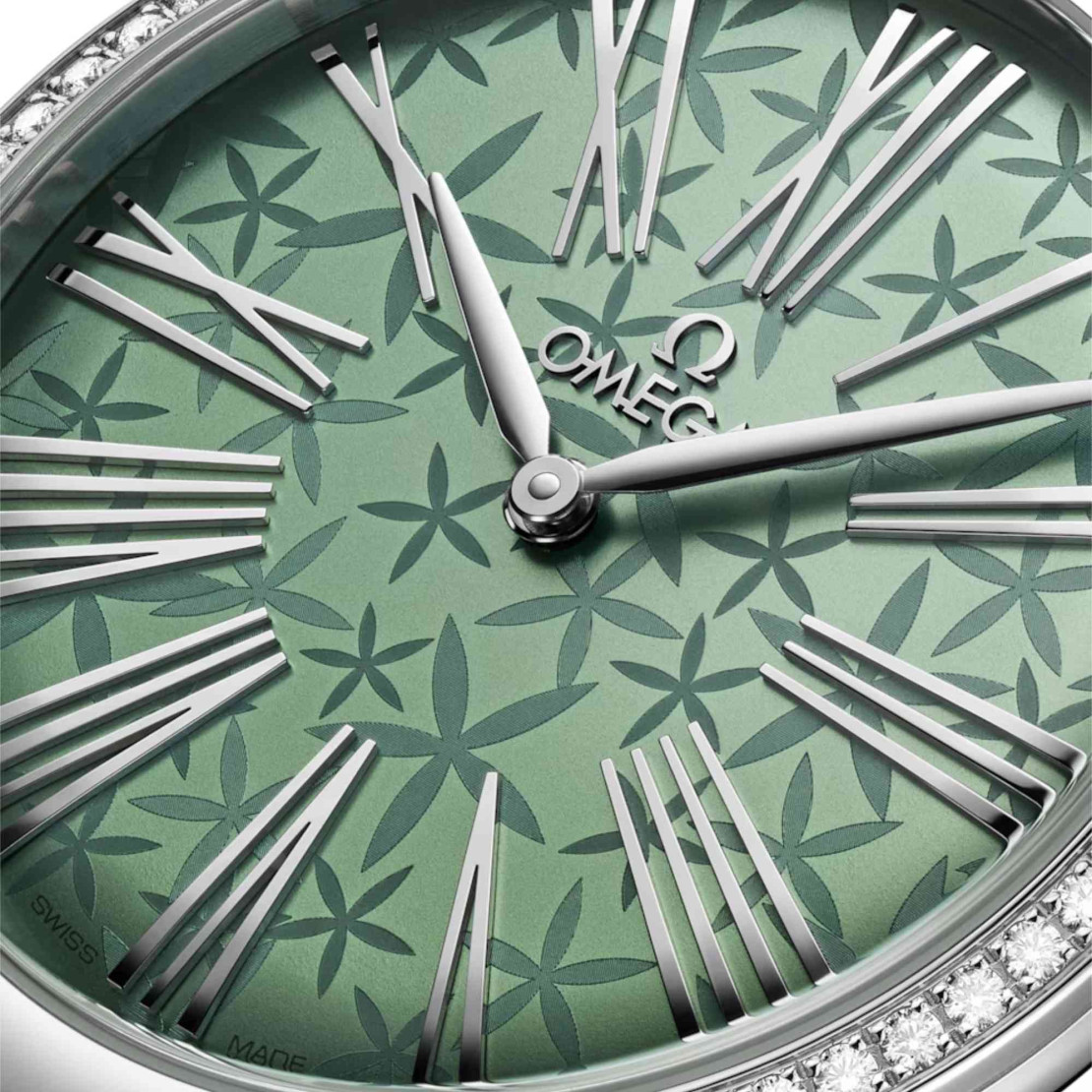 Das 36-mm-Gehäuse aus poliertem Edelstahl ist mit 38 Diamanten im Brillantschliff (0,49 Karat) besetzt, die die Seiten zieren. Unter dem gewölbten Saphirglas findet sich ein sandgestrahltes Zifferblatt mit grüner PVD-Beschichtung und Jasmin-Dekor, das mithilfe eines Lasers umgesetzt wurde. Ein einzelner Diamant im Brillantschliff wurde in die Krone eingesetzt. Die Zeiger, Indizes und das OMEGA Logo sind rhodiniert.