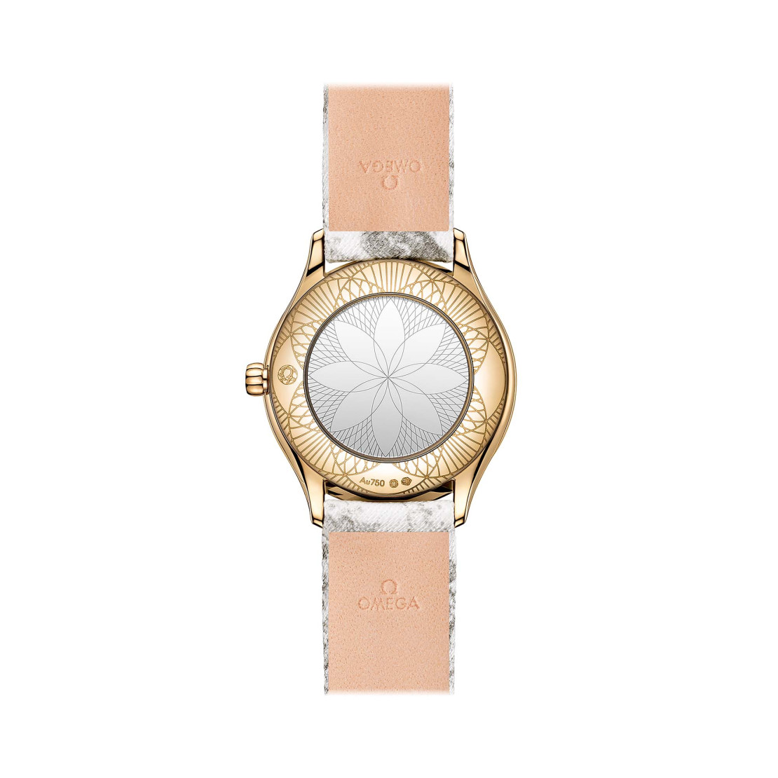 Ref. 428.57.26.60.04.002 - Die Mini Trésor ist eine feinere Version von OMEGAs modernster Damenkollektion. Mit ihrer kompakten Größe und ihrem dynamischen Stil ist sie ein echter Blickfang am Handgelenk. Dieses Modell aus 18 K Moonshine™-Gold besitzt ein 26-mm-Gehäuse mit einem elegant geschwungenen Diamantbesatz an jeder Seite. Die Krone ist mit einem einzelnen Diamanten besetzt, der von einer Blume aus roter Flüssigkeramik umrahmt wird. Das gewölbte Zifferblatt wurde aus cremefarbenem „Grand Feu“-Email gefertigt und ist mit diamantpolierten Zeigern aus 18 K Moonshine™-Gold sowie in Grau aufgedruckten römischen Ziffern versehen. Die Uhr wird von einem einzigartigen Armband aus „Toile de Jouy“ mit schwarzem Schmetterlings-Design am Handgelenk gehalten. Für den Antrieb sorgt das OMEGA Kaliber 4061, das sich hinter einem metallisierten Gehäuseboden aus Saphirglas mit Spiegeleffekt und „Her Time“-Motiv verbirgt.