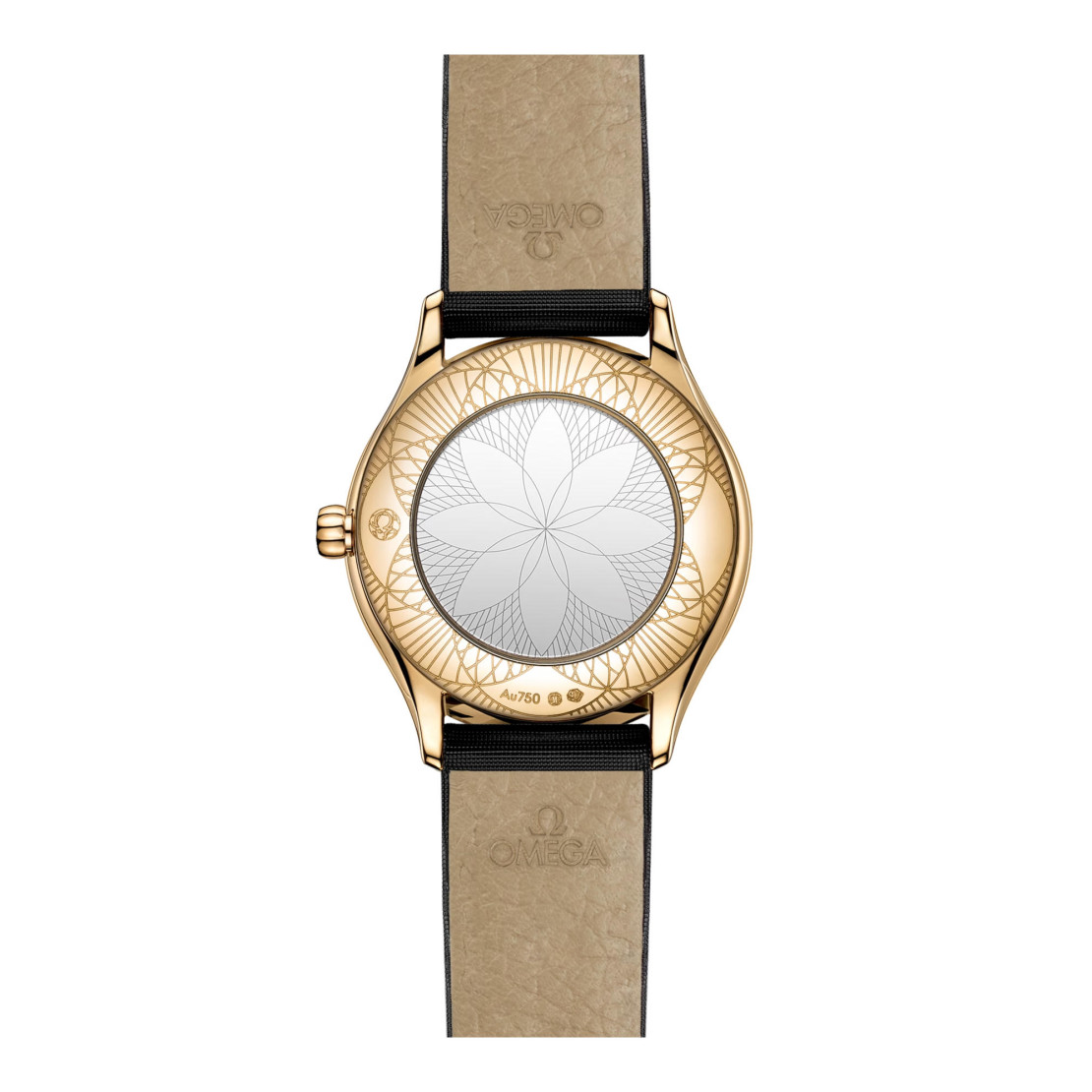 Präsentiert wird die Uhr an einem schwarzen Satinarmband mit Trésor-Schließe. Für den Antrieb sorgt das OMEGA Kaliber 4061, das sich hinter einem speziellen, verspiegelten Gehäuseboden mit metallisiertem „Her Time“-Motiv befindet.