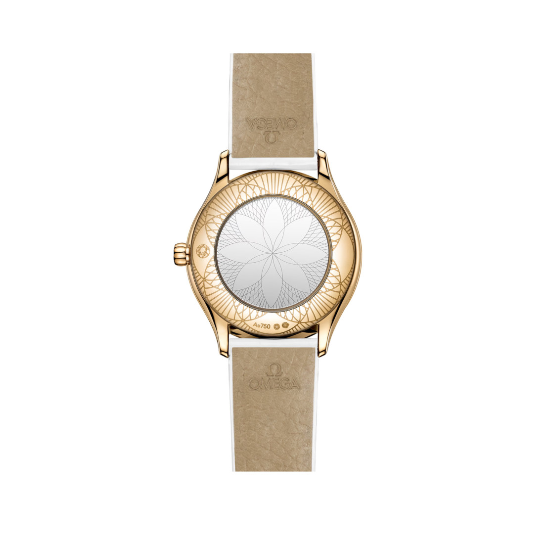 Präsentiert wird die Uhr an einem weiß lackierten Alligatorlederarmband mit Trésor-Schließe. Für den Antrieb sorgt das OMEGA Kaliber 4061, das sich hinter einem speziellen, verspiegelten Gehäuseboden mit metallisiertem „Her Time“-Motiv befindet.