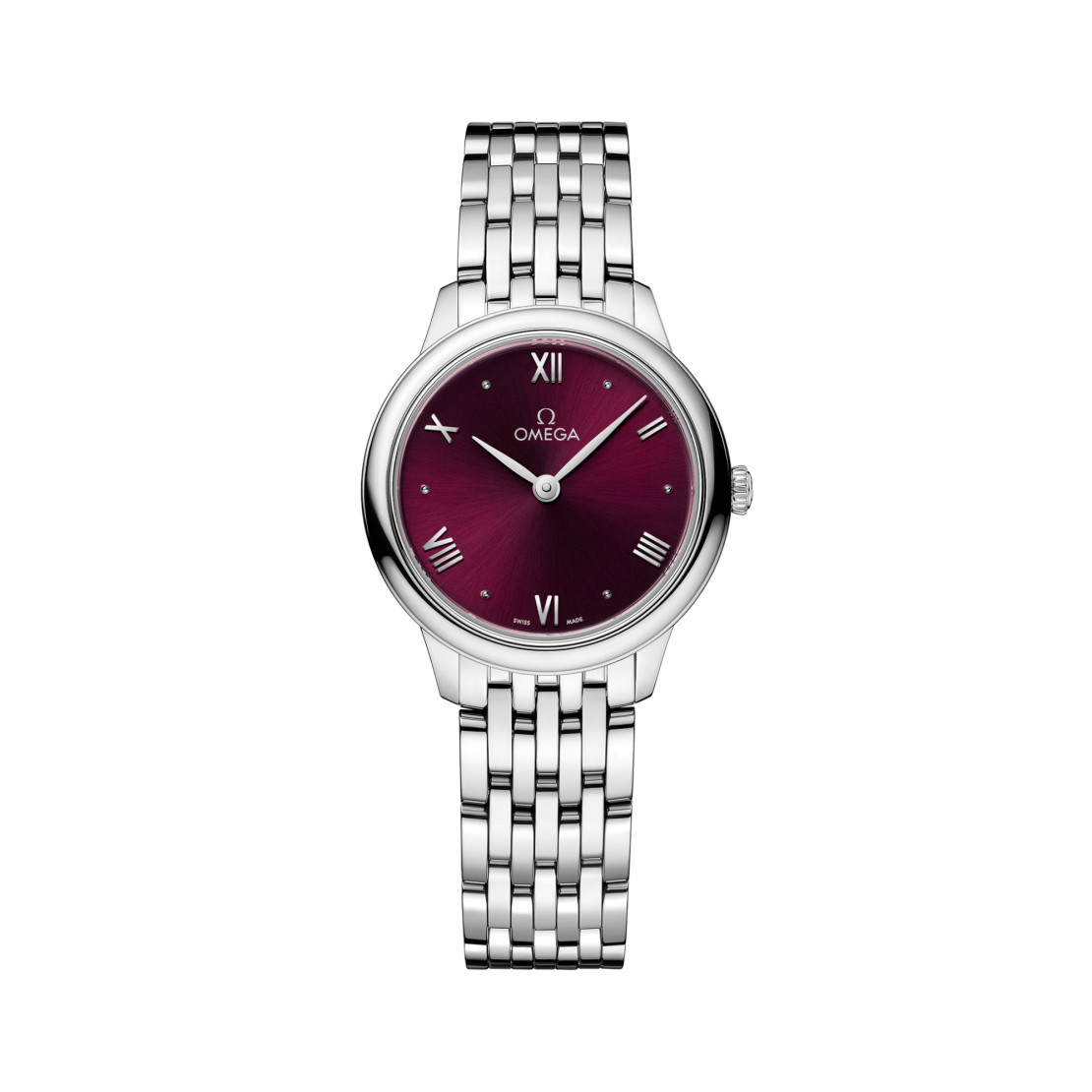 Dieses 27,5-mm-Modell aus Edelstahl besitzt ein Zifferblatt mit rotvioletter PVD-Beschichtung und Sonnenschliff. Die Anzeige zeichnet sich durch rhodinierte Zeiger sowie alternierende römische Ziffern und Cabochon-Indizes aus. Der schlichte Look des Zeitmessers wird durch einen soliden Gehäuseboden mit einer Prägung des Gottes Chronos ergänzt.