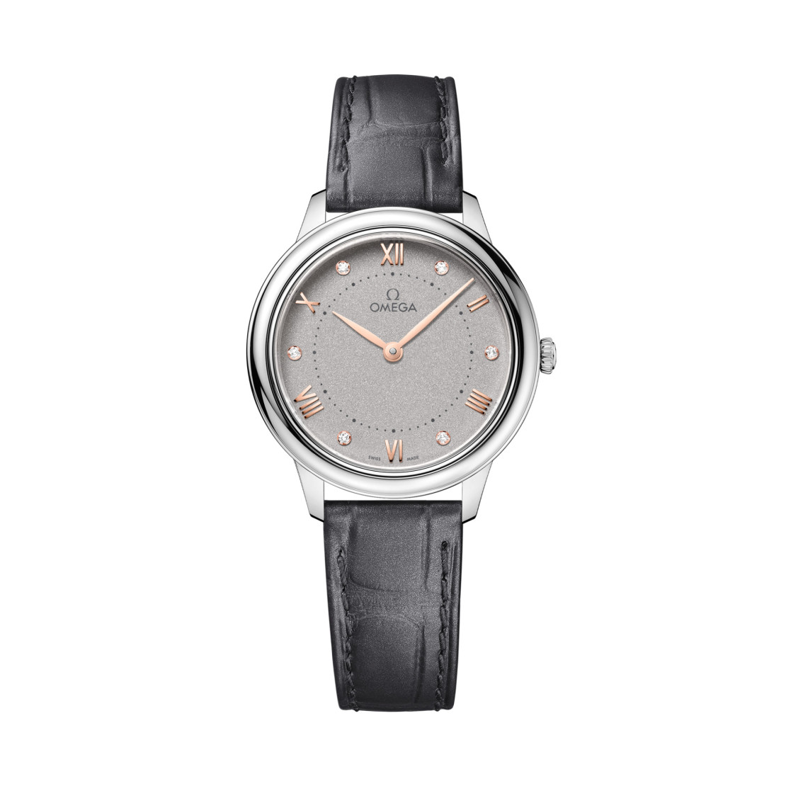 Ref. 434.13.30.60.56.001 - Die OMEGA De Ville Prestige ist seit 1994 eine zeitlose Kollektion. Jetzt erscheint die dritte Generation der Ikone. Mit einer Auswahl an Mustern, Veredelungen und Farben repräsentieren diese Zeitmesser klassisches Design sowie Eleganz und passen sich verschiedensten Lifestyles und Persönlichkeiten an. Dieses 30-mm-Modell aus Edelstahl besitzt ein rhodiumgraues Zifferblatt mit kristallinem Finish. Die Anzeige zeichnet sich durch Zeiger mit PVD-Beschichtung aus Sedna™-Gold sowie alternierende römische Ziffern und Diamantindizes und Halterungen aus 18 K Sedna™-Gold aus. Der schlichte Look des Zeitmessers wird durch einen gepunkteten inneren Minutenring und einen soliden Gehäuseboden mit einer Prägung des Gottes Chronos ergänzt. Die Uhr wird von einem schimmernden dunkelgrauen Lederarmband am Handgelenk gehalten und von dem OMEGA Quarzkaliber 4061 mit einer Batterielaufzeit von mindestens 48 Monaten angetrieben.