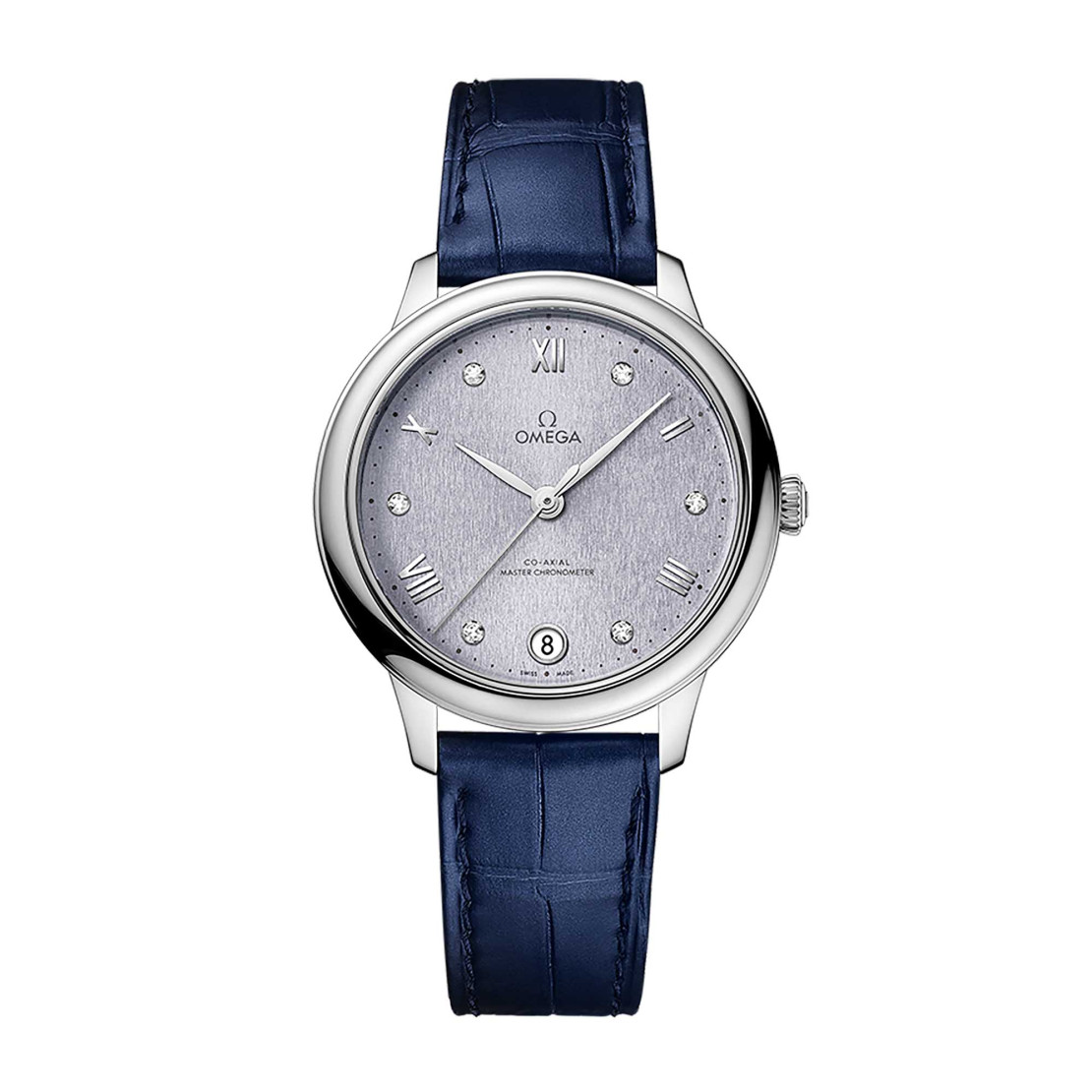Ref. 434.13.34.20.53.001 - Die OMEGA De Ville Prestige ist seit 1994 eine zeitlose Kollektion. Jetzt erscheint die dritte Generation der Ikone. Mit einer Auswahl an Mustern, Veredelungen und Farben repräsentieren diese Zeitmesser klassisches Design sowie Eleganz und passen sich verschiedensten Lifestyles und Persönlichkeiten an. Dieses 34-mm-Modell aus Edelstahl besitzt ein Zifferblatt mit lavendelfarbener PVD-Beschichtung, Sonnenschliff und einer variierenden vertikalen Prägung. Die Anzeige zeichnet sich durch rhodinierte Zeiger sowie alternierende römische Ziffern und Diamantindizes aus. Der schlichte Look des Zeitmessers wird durch ein Datumsfenster bei 6 Uhr und einen gepunkteten äußeren Minutenring ergänzt. Diese als Master Chronometer zertifizierte Uhr wird von einem schimmernden hellblauen Lederarmband am Handgelenk gehalten und von dem OMEGA Master Co-Axial Kaliber 8800 angetrieben, das durch den kratzfesten Saphirglasboden bewundert werden kann.