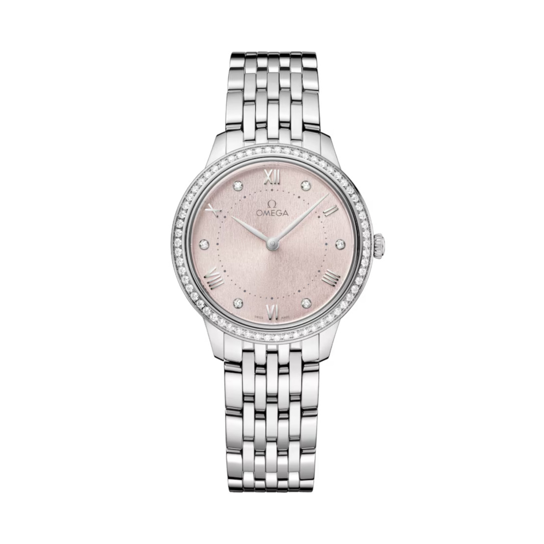 Ref. 434.15.30.60.52.001 - Dieses 30-mm-Modell aus Edelstahl besitzt eine diamantbesetzte Lünette und ein Zifferblatt mit rosé-silberner PVD-Beschichtung, Sonnenschliff und einer variierenden vertikalen Prägung. Die Anzeige zeichnet sich durch rhodinierte Zeiger sowie alternierende römische Ziffern und Diamantindizes aus.