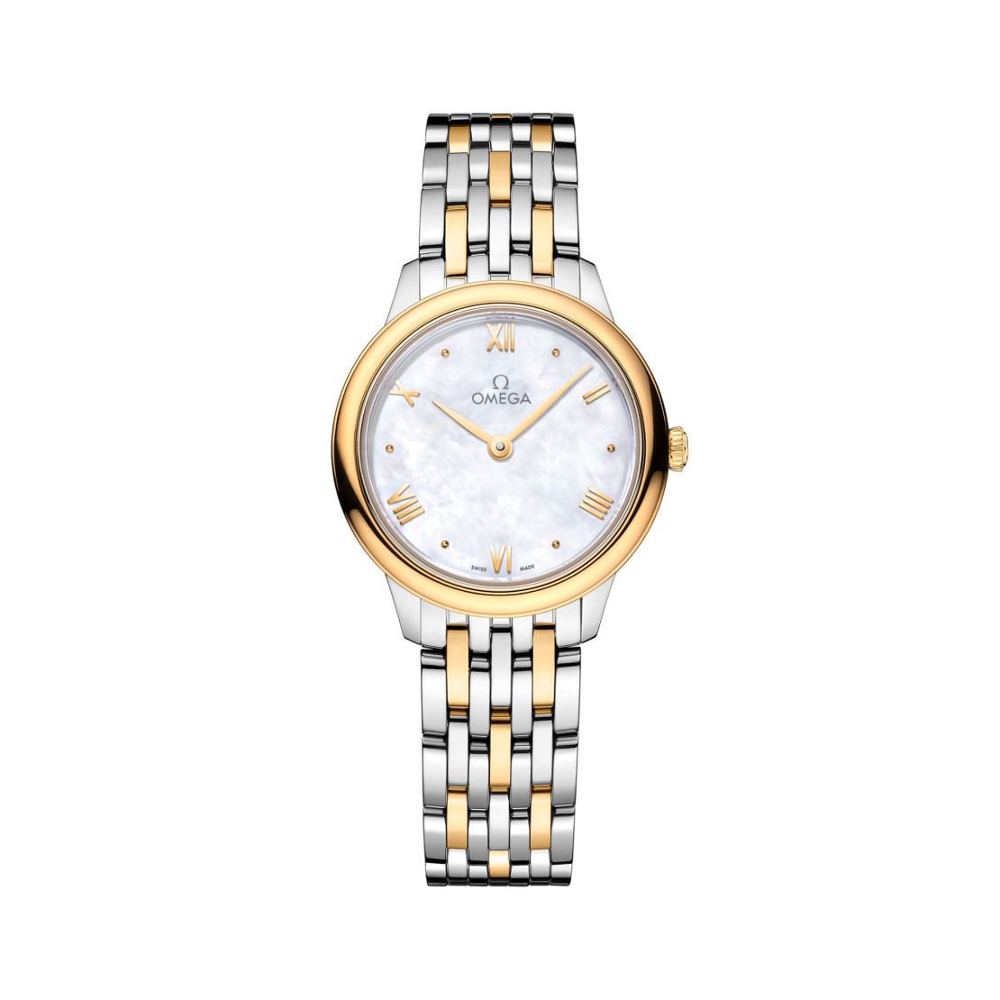 Dieses 27,5-mm-Modell aus Edelstahl und 18 K Gelbgold besitzt ein Zifferblatt aus weißem Perlmutt. Die Anzeige zeichnet sich durch mit Gelbgold vergoldete Zeiger sowie alternierende römische Ziffern und Cabochon-Indizes aus. Der schlichte Look des Zeitmessers wird durch einen soliden Gehäuseboden mit einer Prägung des Gottes Chronos ergänzt.