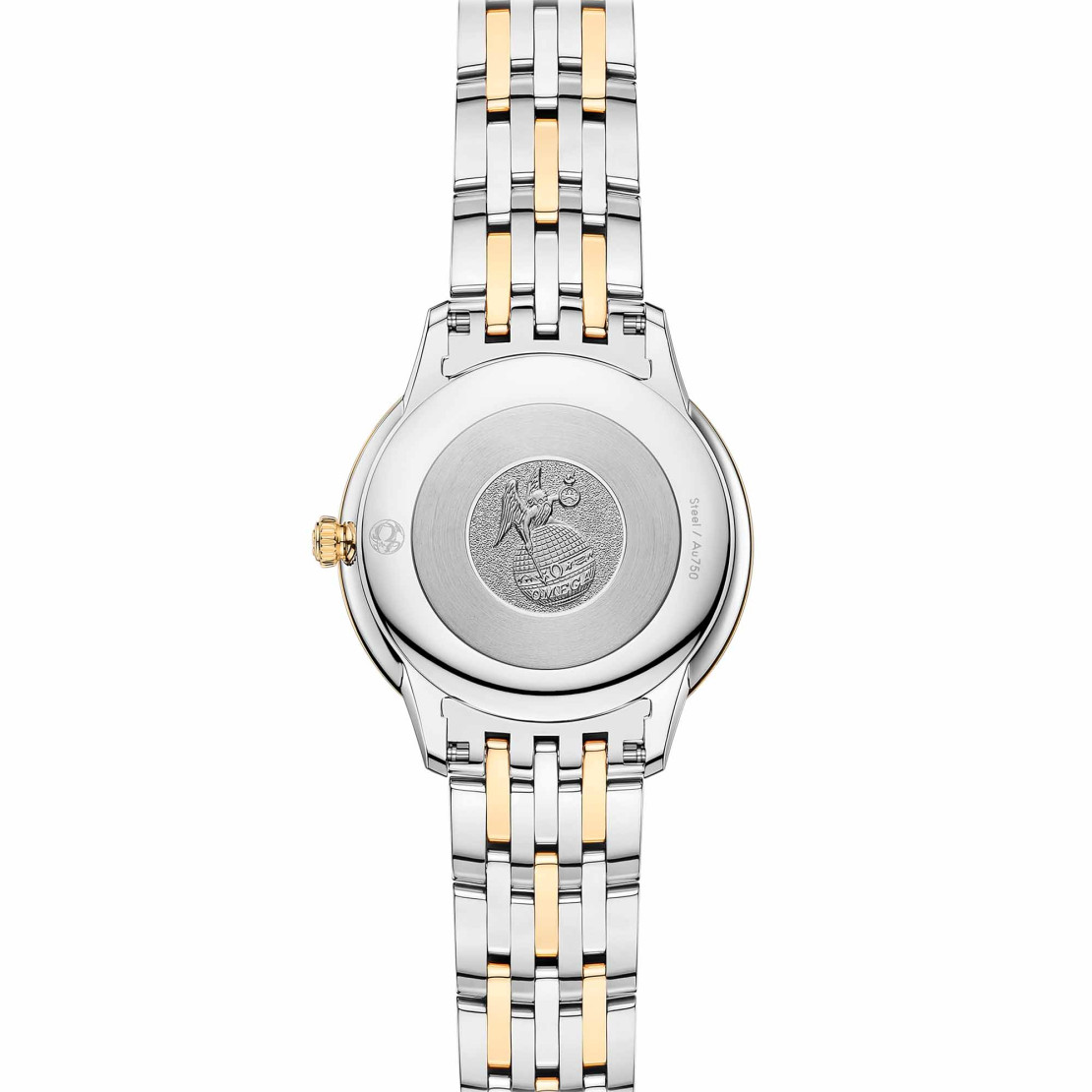 Ref. 434.20.30.60.02.002 - Die OMEGA De Ville Prestige ist seit 1994 eine zeitlose Kollektion. Jetzt erscheint die dritte Generation der Ikone. Mit einer Auswahl an Mustern, Veredelungen und Farben repräsentieren diese Zeitmesser klassisches Design sowie Eleganz und passen sich verschiedensten Lifestyles und Persönlichkeiten an. Dieses 30-mm-Modell aus Edelstahl und 18 K Gelbgold besitzt ein silbernes Zifferblatt mit kristallinem Finish. Die Anzeige zeichnet sich durch mit Gelbgold vergoldete Zeiger sowie alternierende römische Ziffern und Cabochon-Indizes aus. Der schlichte Look des Zeitmessers wird durch einen gepunkteten inneren Minutenring und einen soliden Gehäuseboden mit einer Prägung des Gottes Chronos ergänzt. Die Uhr wird von einem Armband aus Edelstahl und Gelbgold am Handgelenk gehalten und von dem OMEGA Quarzkaliber 4061 mit einer Batterielaufzeit von mindestens 48 Monaten angetrieben.