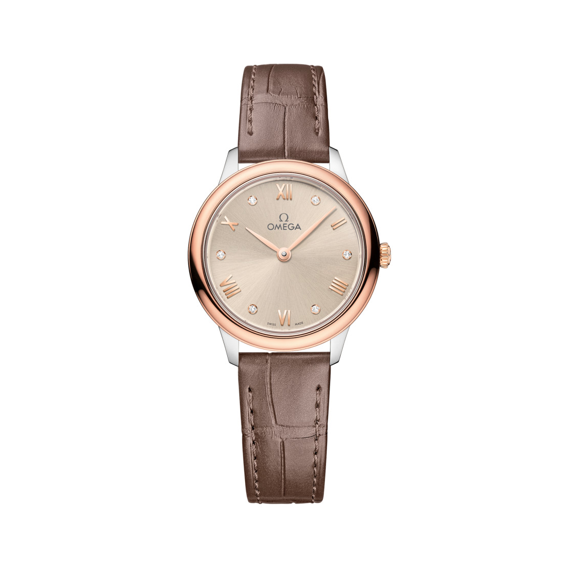 Die Uhr wird von einem schimmernden taupefarbenen Lederarmband am Handgelenk gehalten und von dem OMEGA Quarzkaliber 4061 mit einer Batterielaufzeit von mindestens 48 Monaten angetrieben.