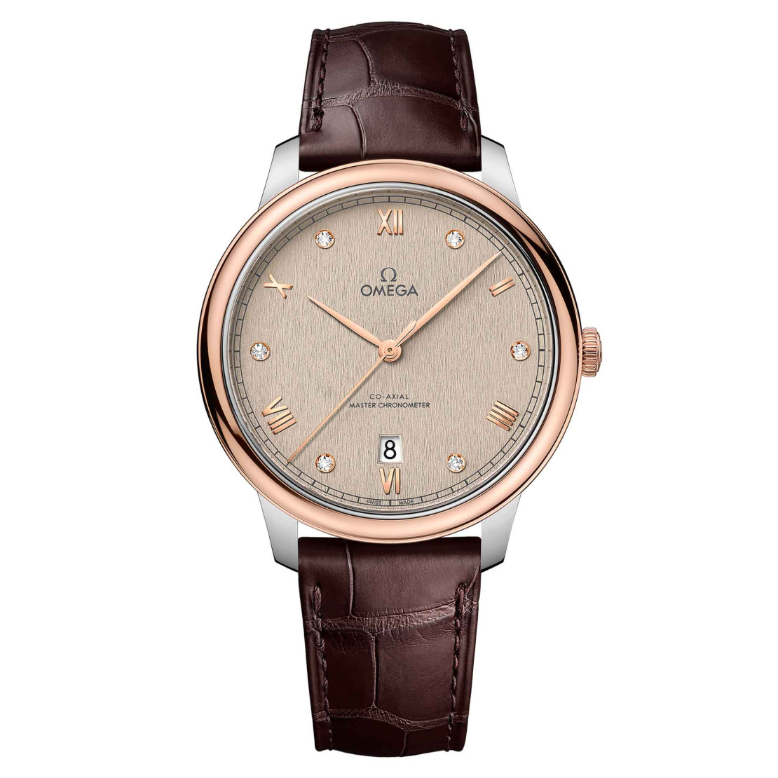 Ref. 434.23.40.20.59.001 - Die OMEGA De Ville Prestige ist seit 1994 eine zeitlose Kollektion. Jetzt erscheint die dritte Generation der Ikone. Mit einer Auswahl an Mustern, Veredelungen und Farben repräsentieren diese Zeitmesser klassisches Design sowie Eleganz und passen sich verschiedensten Lifestyles und Persönlichkeiten an. Dieses 40-mm-Modell aus Edelstahl und 18 K Sedna™-Gold besitzt ein flaches Zifferblatt leinenfarbener PVD-Beschichtung, Opalisierung und einer variierenden vertikalen Prägung. Die Anzeige zeichnet sich durch Zeiger mit PVD-Beschichtung aus Sedna™-Gold sowie alternierende römische Ziffern und Diamantindizes in Halterungen aus 18 K Sedna™-Gold aus. Der schlichte Look des Zeitmessers wird durch ein Datumsfenster bei 6 Uhr und einer äußeren „Eisenbahn“-Minuterie ergänzt. Diese als Master Chronometer zertifizierte Uhr wird von einem braunen Lederarmband am Handgelenk gehalten und von dem OMEGA Master Co-Axial Kaliber 8800 angetrieben, das durch den kratzfesten Saphirglasboden bewundert werden kann.