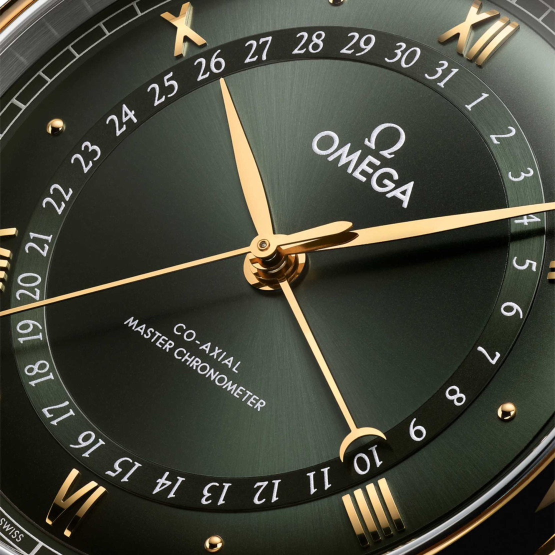 Die De Ville Prestige wird von einem grünen Lederarmband am Handgelenk gehalten und vom Co-Axial Master Chronometer Kaliber 8936 angetrieben, das durch das Saphirglas des Gehäusebodens sichtbar ist.