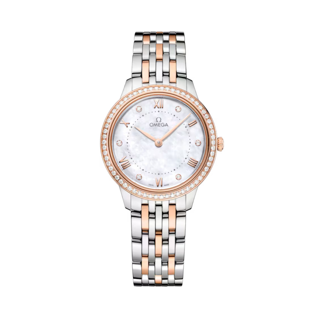 Ref. 434.25.30.60.55.001 - Dieses 30-mm-Modell aus Edelstahl und 18 K Sedna™-Gold besitzt eine diamantbesetzte Lünette und ein Zifferblatt aus weißem Perlmutt. Die Anzeige zeichnet sich durch Zeiger mit PVD-Beschichtung aus Sedna™-Gold sowie alternierende römische Ziffern und Diamantindizes in Halterungen aus 18 K Sedna™-Gold aus.