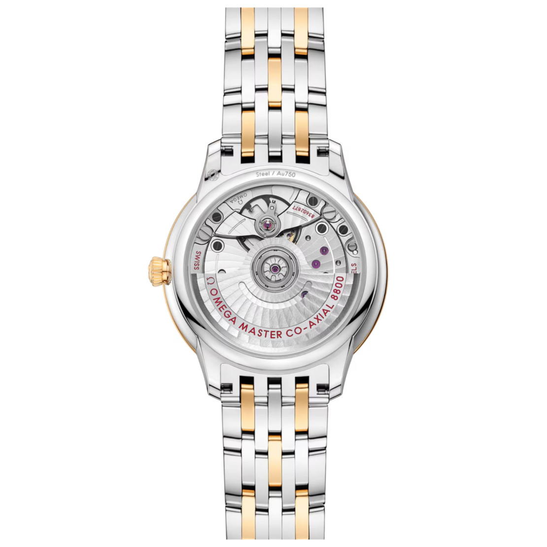 Diese als Master Chronometer zertifizierte Uhr wird von einem Armband aus Edelstahl und Gelbgold am Handgelenk gehalten und von dem OMEGA Master Co-Axial Kaliber 8800 angetrieben, das durch den kratzfesten Saphirglasboden bewundert werden kann.