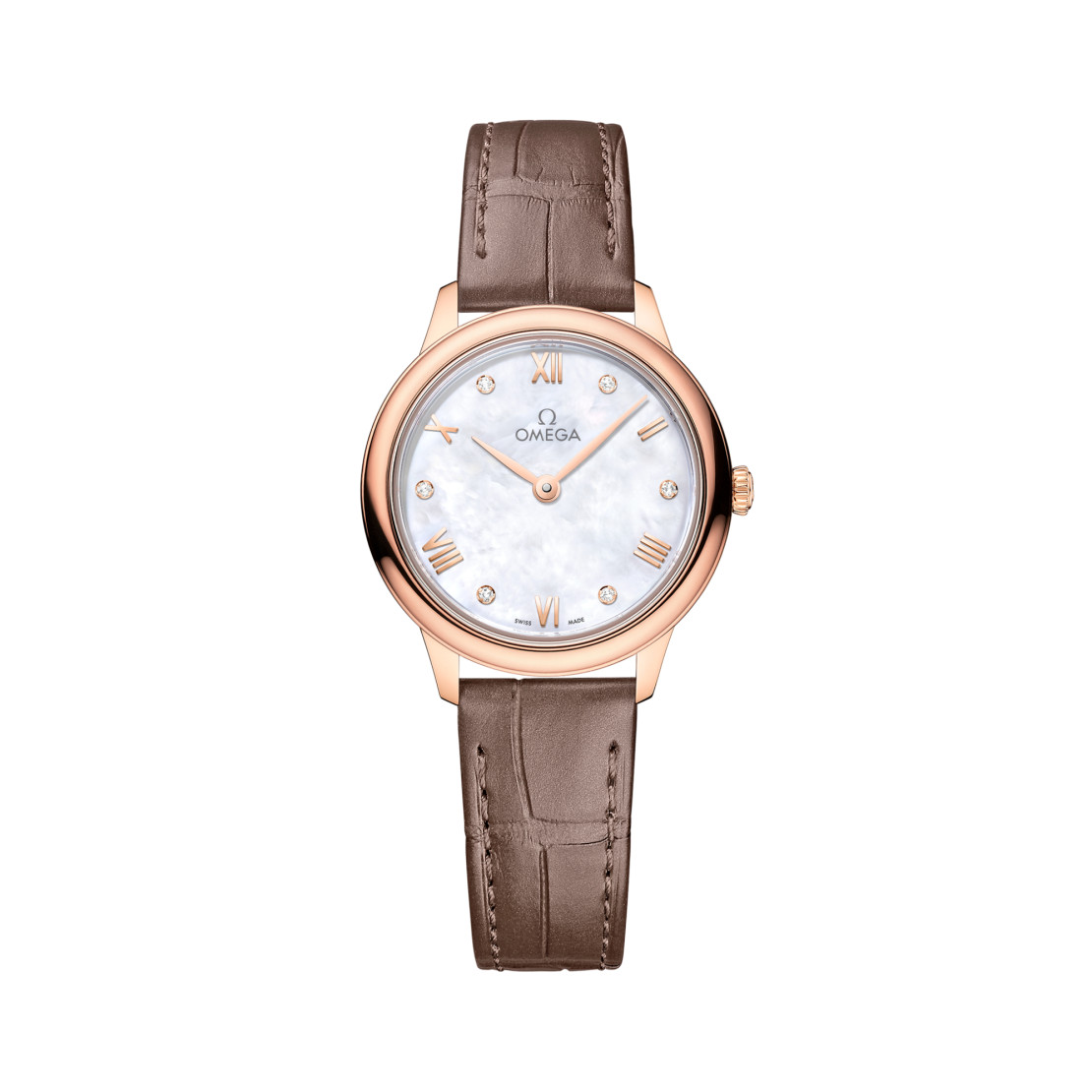 Ref. 434.53.28.60.55.001 - Die OMEGA De Ville Prestige ist seit 1994 eine zeitlose Kollektion. Jetzt erscheint die dritte Generation der Ikone. Mit einer Auswahl an Mustern, Veredelungen und Farben repräsentieren diese Zeitmesser klassisches Design sowie Eleganz und passen sich verschiedensten Lifestyles und Persönlichkeiten an. Dieses 27,5-mm-Modell aus 18 K Sedna™-Gold besitzt ein Zifferblatt aus weißem Perlmutt. Die Anzeige zeichnet sich durch Zeiger mit PVD-Beschichtung aus Sedna™-Gold sowie alternierende römische Ziffern und Diamantindizes in Halterungen aus 18 K Sedna™-Gold aus. Der schlichte Look des Zeitmessers wird durch einen soliden Gehäuseboden mit einer Prägung des Gottes Chronos ergänzt. Die Uhr wird von einem schimmernden taupefarbenen Lederarmband am Handgelenk gehalten und von dem OMEGA Quarzkaliber 4061 mit einer Batterielaufzeit von mindestens 48 Monaten angetrieben.