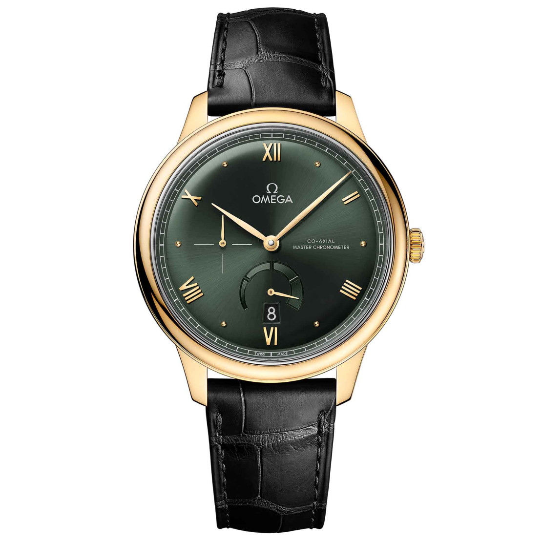 Ref. 434.53.41.21.10.001 - Die OMEGA De Ville Prestige ist seit 1994 eine zeitlose Kollektion. Jetzt erscheint die dritte Generation der Ikone. Mit einer Auswahl an Mustern, Veredelungen und Farben repräsentieren diese Zeitmesser klassisches Design sowie Eleganz und passen sich verschiedensten Lifestyles und Persönlichkeiten an. Dieses 41-mm-Modell aus 18 K Gelbgold besitzt ein gewölbtes Zifferblatt mit dunkelgrüner PVD-Beschichtung und Sonnenschliff. Die Anzeige zeichnet sich durch mit Gelbgold vergoldete Zeiger sowie alternierende römische Ziffern und Cabochon-Indizes aus. Die 270°-Gangreserveanzeige befindet sich bei 6 Uhr. Sie wird durch vier sektorielle Ausschnitte in Halbmondform und eine applizierte Unterplatte mit dezent kontrastierender Veredelung im gleichen Farbton dargestellt. Der schlichte Look des Zeitmessers wird durch ein Datumsfenster bei 6 Uhr, ein Hilfszifferblatt für die Sekunden bei 9 Uhr und eine äußere „Eisenbahn“-Minuterie ergänzt. Diese als Master Chronometer zertifizierte Uhr wird von einem schwarzen Lederarmband am Handgelenk gehalten und von dem OMEGA Master Co-Axial Kaliber 8810 angetrieben, das durch den kratzfesten Saphirglasboden bewundert werden kann.