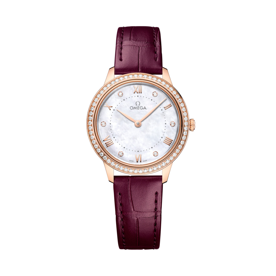 Ref. 434.58.30.60.55.001 - Die OMEGA De Ville Prestige ist seit 1994 eine zeitlose Kollektion. Jetzt erscheint die dritte Generation der Ikone. Mit einer Auswahl an Mustern, Veredelungen und Farben repräsentieren diese Zeitmesser klassisches Design sowie Eleganz und passen sich verschiedensten Lifestyles und Persönlichkeiten an. Dieses 30-mm-Modell aus 18 K Sedna™-Gold mit diamantbesetzter Lünette besitzt ein Zifferblatt aus weißem Perlmutt. Die Anzeige zeichnet sich durch Zeiger mit PVD-Beschichtung aus Sedna™-Gold sowie alternierende römische Ziffern und Diamantindizes und Halterungen aus 18 K Sedna™-Gold aus. Der schlichte Look des Zeitmessers wird durch einen gepunkteten inneren Minutenring und einen soliden Gehäuseboden mit einer Prägung des Gottes Chronos ergänzt. Die Uhr wird von einem schimmernden burgunderroten Lederarmband am Handgelenk gehalten und von dem OMEGA Quarzkaliber 4061 mit einer Batterielaufzeit von mindestens 48 Monaten angetrieben.