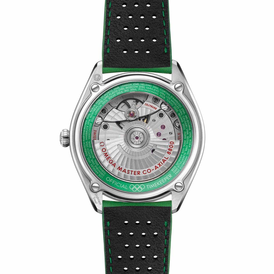 Ref. 522.32.40.20.01.005 - Die Seamaster Olympic Games Kollektion wurde von den olympischen Ringen und dem Design der OMEGA Stoppuhren der Vergangenheit inspiriert. Das 39,5 mm-Modell verfügt über ein Edelstahlgehäuse und ein grünes, mikroperforiertes Lederarmband. Das gewölbte Zifferblatt in Schwarz und Weiß besticht mit sportlichen Zeigern, einem Datumsfenster und einem gut ablesbaren Minutenring. Hinzu kommt ein grüner Pulsmesser, über den der Träger seine Pulsfrequenz/Minute berechnen kann. Auf dem Gehäuseboden befindet sich ein grüner eloxierter Aluminiumring, auf dem alle Austragungsorte und Termine der Olympischen Spiele mit Beteiligung von OMEGA verewigt wurden, von Los Angeles 1932 bis Los Angeles 2028. Angetrieben wird die Uhr von dem Master Chronometer Kaliber 8800. Es wurden gerade einmal 2032 Exemplare dieses Modells gefertigt, wobei die Seriennummer der limitierten Auflage an der Gehäuseseite eingraviert wurde.