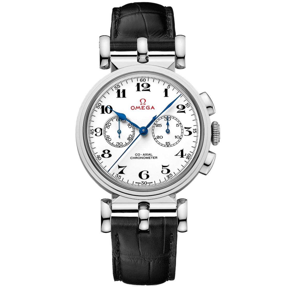 Ref. 522.53.38.50.04.001 - Dieser in limitierter Auflage gefertigte Co-Axial Chronograph vermittelt unmittelbar das Gefühl von sportlicher Spitzenleistung und Erfolg. Mit nur 188 gefertigten Exemplaren ist er eine perfekte Würdigung der langen Geschichte von OMEGA als offizieller Zeitnehmer bei Olympischen Spielen. - Das aus 18 K Weißgold bestehende stilvolle Gehäuse des Zeitmessers ist mit einer gebürsteten Krone mit eingeprägtem polierten Vintage OMEGA Symbol versehen. Auf dem weiß lackierten Zifferblatt ist neben zwei Zählern bei 3 und 9 Uhr mit Zeigern aus gebläutem Stahl ein weiteres Vintage OMEGA Symbol in Rot zu sehen. - Das klassische Erscheinungsbild setzt sich auf einem schwarzen Lederarmband mit fixierten T-Stegen aus 18 K Weißgold fort, und die Rückseite des Gehäuses trägt eine Gravur, die an die Olympischen Spiele erinnert, sowie eine individuelle Seriennummer. - Unter dem Zifferblatt verbirgt sich das exklusive OMEGA Kaliber 3203, das eine uhrmacherische Höchstleistung darstellt.