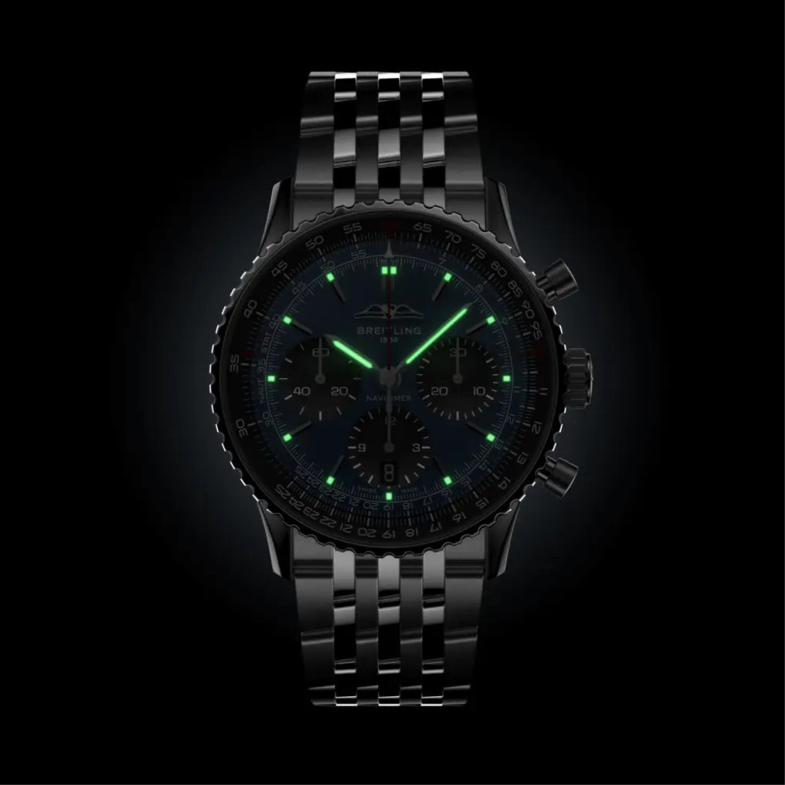Blau mit farblich abgesetzten Chronographenzählern und applizierten Indizes
