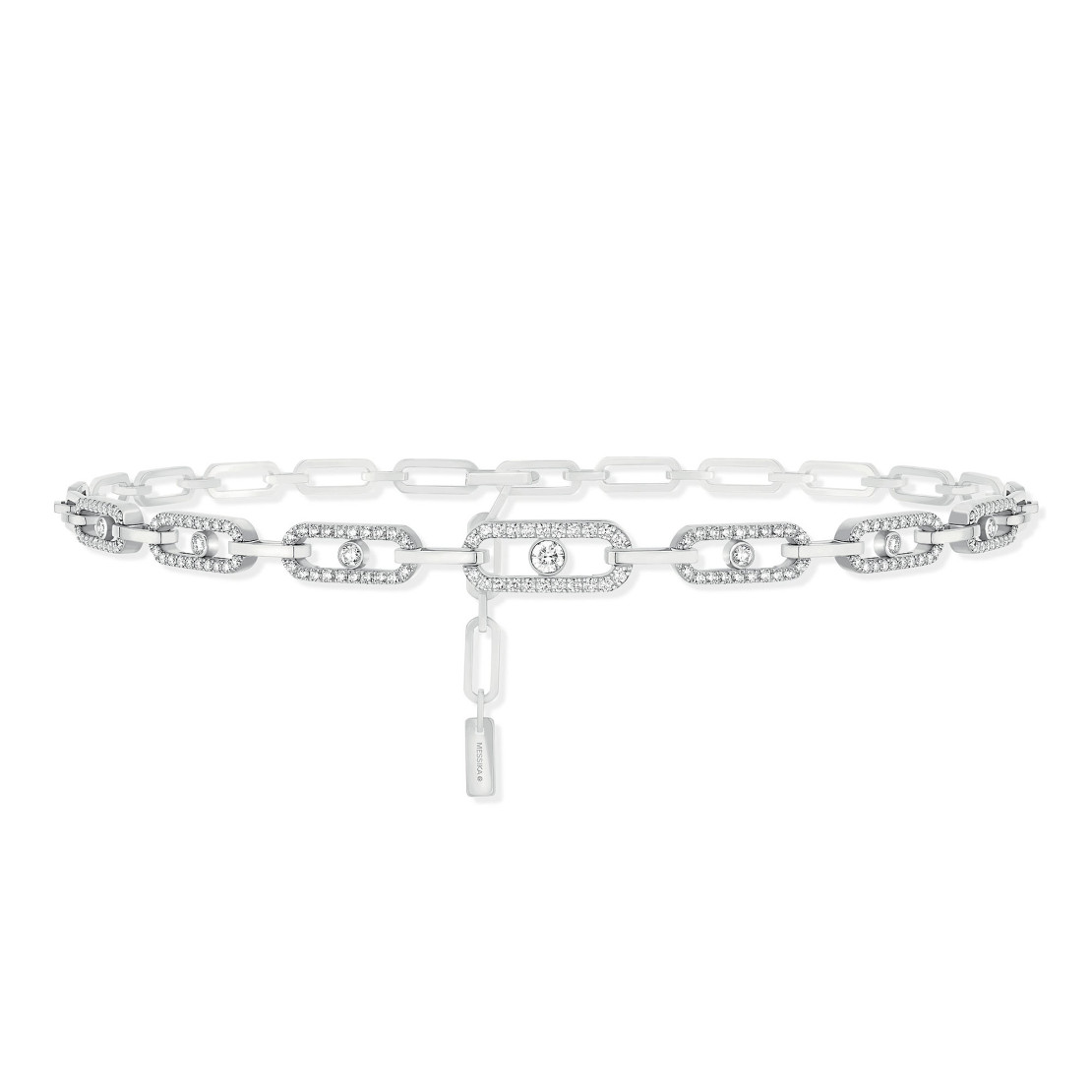 Ref. 12010-WG - Auf der Suche nach einem modischen und zugleich luxuriösen Schmuckstück? Der Move Uno Choker – auch Halsband genannt – aus Weißgold und Diamant ist genau das Richtige für Sie! Das Move Uno Kultmotiv von Messika, das mit schillernden Diamanten besetzt ist, verleiht dieser Diamant-Halskette für Damen einen ausdrucksstarken Look und macht sie zu einem echten Blickfang. Tagsüber zu einem weißen Hemd und abends zu einem Cocktailkleid getragen, ist sie der perfekte Verbündete für Tag und Nacht. Sie verleiht Ihrem Look einen unverwechselbaren Touch und setzt Ihren Hals sinnlich in Szene. Das handgefertigte Luxus-Schmuckstück wird Sie durch seine Geschmeidigkeit überraschen, die ihm einen einzigartigen Komfort verleiht.