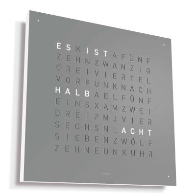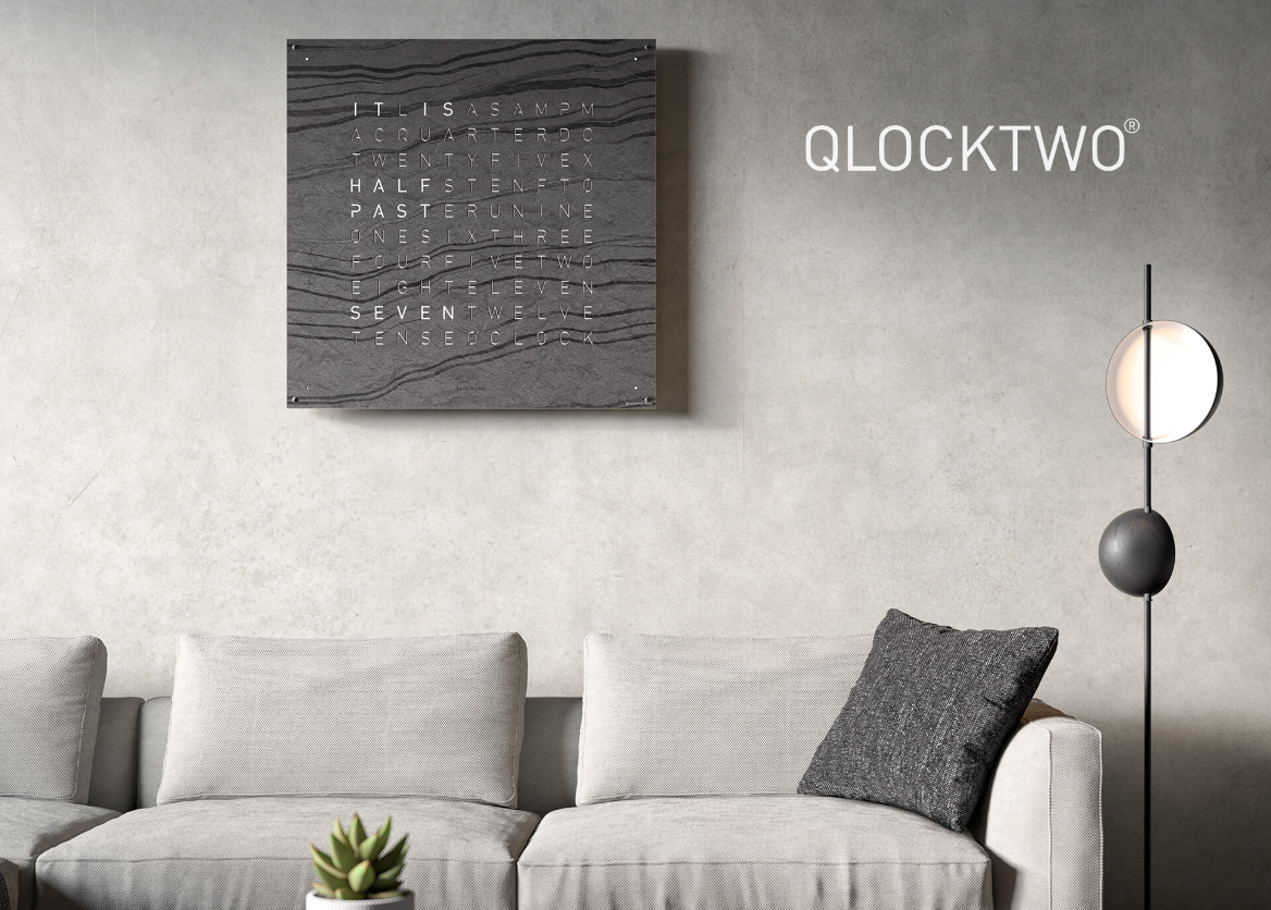 QLOCKTWO zelebriert die Zeit auf besondere Weise. Die typografische Anzeige verbindet den Moment mit dem geschriebenen Wort und macht ihn zum Statement „Es ist halb acht". Eine Matrix aus 110 scheinbar willkürlich angeordneten Schriftzeichen bildet die Grundlage. Die einzelnen Buchstaben werden durch Leuchtflächen zu Worten zusammengesetzt. Sie beschreiben die Uhrzeit in Fünf-Minuten-Schritten. 4 Leuchtpunkte in den Ecken sorgen für die minutengenaue Anzeige.